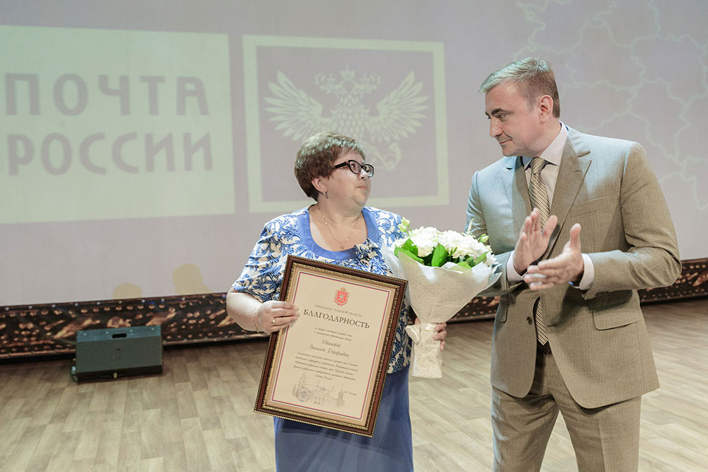 15 июля в Туле состоялось областное торжественное собрание, посвященное Дню российской почты. Губернатор Тульской области Алексей Дюмин отметил, что, несмотря на стремительно развивающиеся информационные технологии, почта остается одним из самых массовых и доступных видов связи. По словам главы региона, «Почта России» идет в ногу со временем, сохраняя свой главный принцип – работать для людей. «Вы активно внедряете новые электронные сервисы. Одним из примеров можно назвать использование электронной подписи, позволяющей сократить время обслуживания клиента в 2 раза. Более 160 тысяч жителей Тульской области уже успели оценить удобство этого сервиса», - сказал Губернатор. Он также отметил, что сегодня в тульском филиале «Почты России» трудятся более трех тысяч человек. «Неизменной остается ваша социальная миссия. Вам приходится работать в любую погоду, ведь каждый день вас ждут тысячи людей по всему региону. Очень часто вы выполняете роль социальных работников, психологов. Для пожилых людей, которым вы приносите пенсии, вы становитесь настоящими помощниками и друзьями. Огромное спасибо вам за этот благородный труд, за чуткость и доброту. Вы делаете лучше и комфортнее жизнь людей. Желаю всем вам и вашим близким крепкого здоровья, благополучия и счастья!», - сказал Алексей Дюмин. Губернатор вручил региональные награды отличившимся работникам службы. Сотрудников почты также поздравил генеральный директор «Почты России» Николай Подгузов. В своем выступлении он поблагодарил правительство региона за внимание, уделяемое вопросам развития почтовой связи. Руководитель «Почты России» также вручил ведомственные награды работникам и ветеранам почты. Торжественное собрание продолжилось большим праздничным концертом, в котором принял участие музыкальный коллектив «Синяя птица». Отметим, что праздничные мероприятия в честь работников почты прошли в регионе впервые.